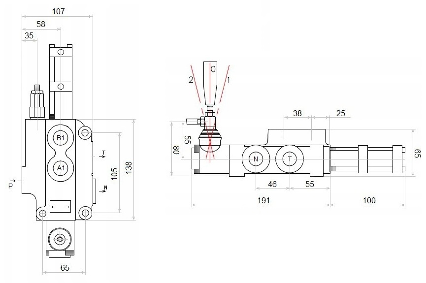 1-teiliger Hydraulikverte iler P80, pneumatisch oder per Hebel betätigt 1 fach